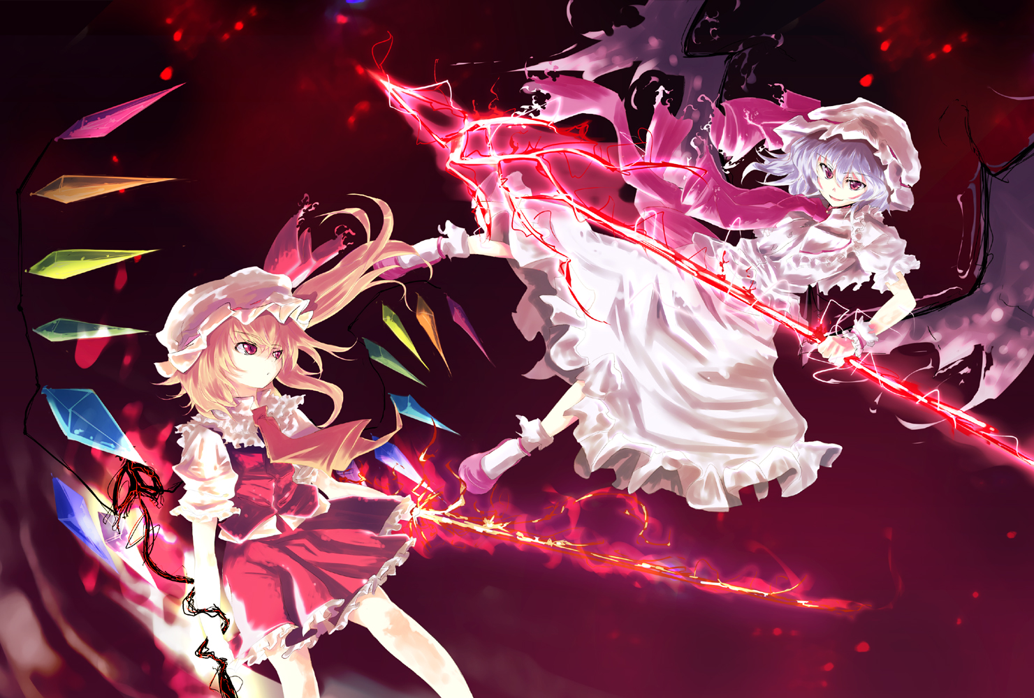 2girlsblonde hairblue hairdressfemale focusgungnir (weapon)hatlaevateinmob capmultiple girlspolearmred eyesribbonshort hairsiblingssisterssmirksocksspear the gungnirswordweaponwings