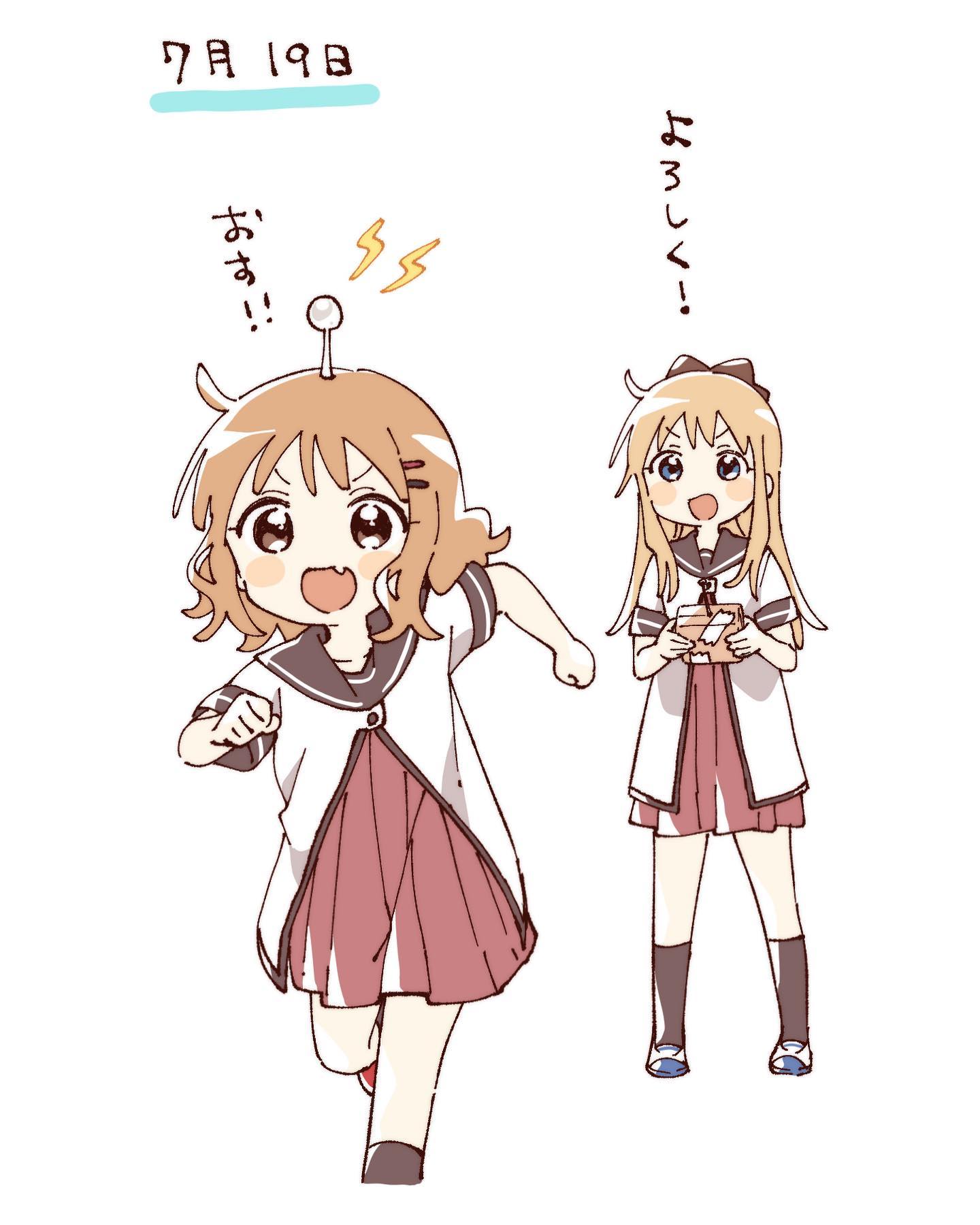 :d2girlsblonde hairblue eyesblue shoesblush stickersbowbrown bowbrown eyesbrown hairbrown sockscontrollercropped legsdressfanghair bowhair ornamenthaircliplong hairmulticolored shoesmultiple girlsnanamori school uniformopen mouthparallel hairclipspleated dressradio antennared dressremote controlrunningschool uniformshirtshoesshort hairshort sleevessimple backgroundsmilesockssummer uniformtwo-tone shoesv-shaped eyebrowswhite backgroundwhite shirtwhite shoes