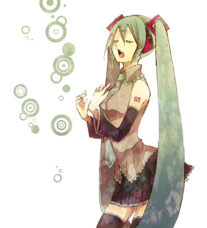 aqua hairclosed eyescolored eyelashesdetached sleeveslong hairmusicnecktiesingingskirtsolothighhighstwintailsvery long hairzettai ryouiki
