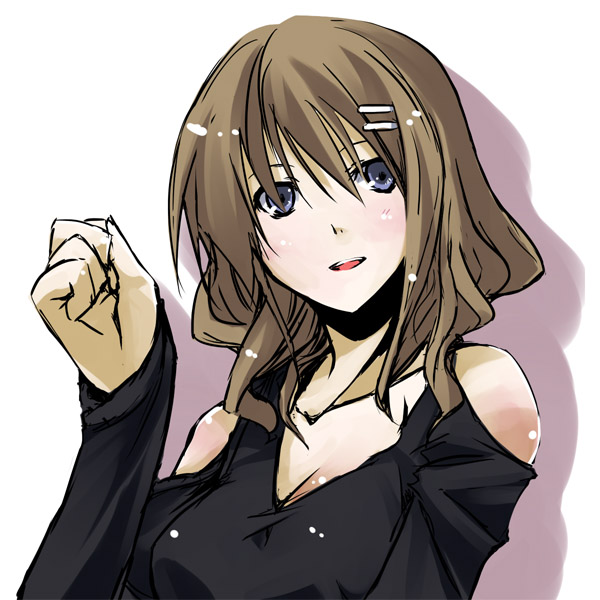 1girlbare shouldersblue eyesbreastsbrown haircleavagecollarbonefemale focushair ornamenthaircliplong hairlong sleevesshort hairsketchsolo