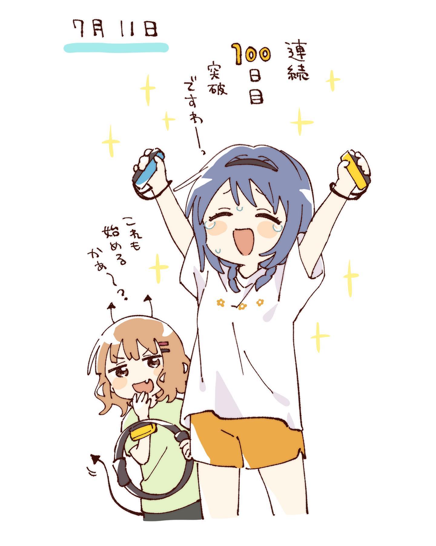 :d1boy2girlsarms upblack hairbandblue hairblush stickersbrown hairclosed eyescontrollercropped legsdemon tailfanggame controllergreen shirthair ornamenthairbandhaircliphand upholdingholding controllerholding game controllerjoy-conmultiple girlsopen mouthorange shortsparallel hairclipsring-conshirtshort hairshort sleevesshortssimple backgroundsmilesparklesweatt-shirttailtearswhite backgroundwhite shirt