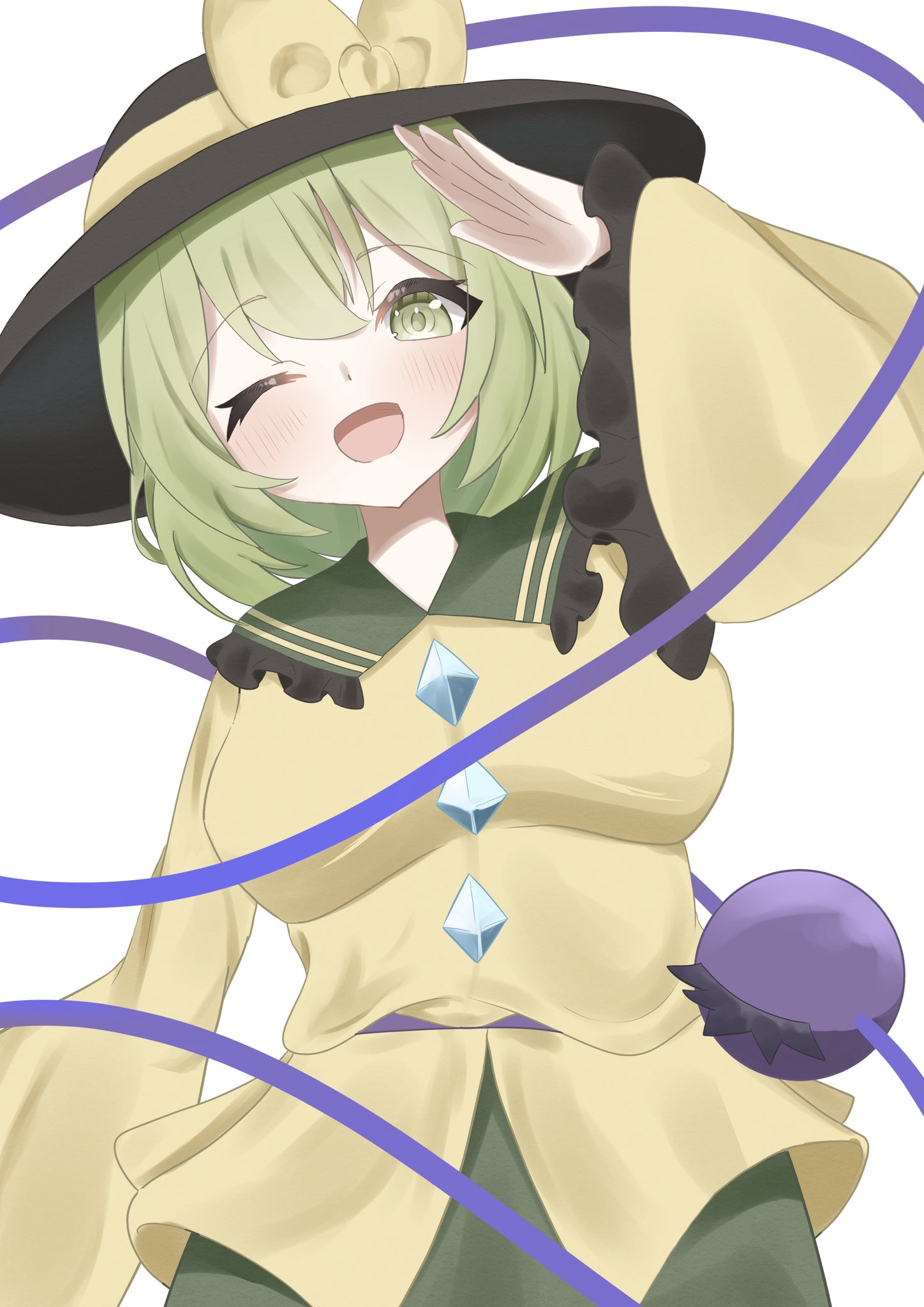 1girlblack hatblouseblushbowbuttonsdiamond buttoneyeballfrilled shirt collarfrilled sleevesfrillsgreen hairgreen skirthathat bowhat ribbonhatsuka2oone eye closedopen mouthribbonshirtskirtsolothird eyewhite backgroundyellow bowyellow ribbonyellow shirt