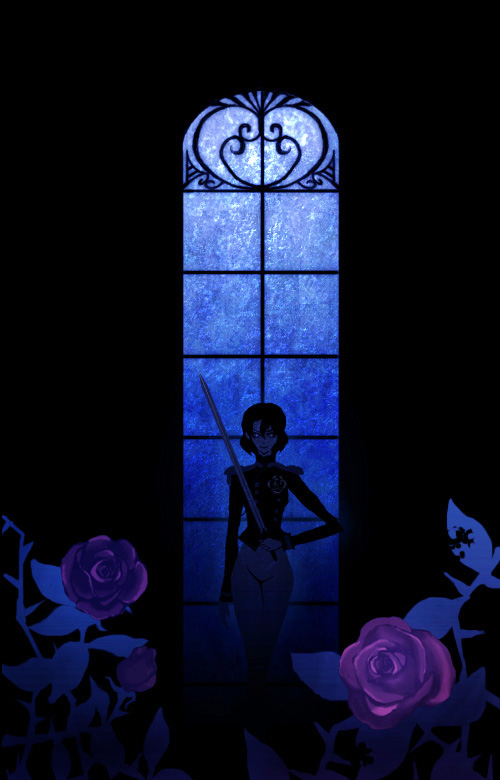 1990s (style)1girlasymmetrical bangsblue themeboutonnierecowboy shotdarkfemale focusflowerholdingholding swordholding weaponretro artstylerosesolostandingswordweaponwindow