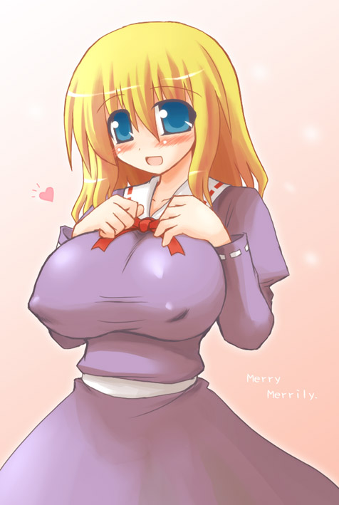 1girlblonde hairblue eyesblushbreastscovered erect nipplesdressfemale focusgradient backgroundhappyhearthuge breastssmilesolo