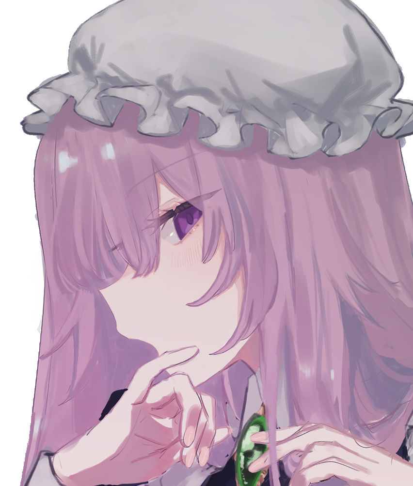 1girlbroochfingernailsgemgreen gemstonegrey hathands uphatjewelrylong hairlooking at viewermob capparted bangsportraitpurple eyespurple hairsimple backgroundsketchsolowhite background