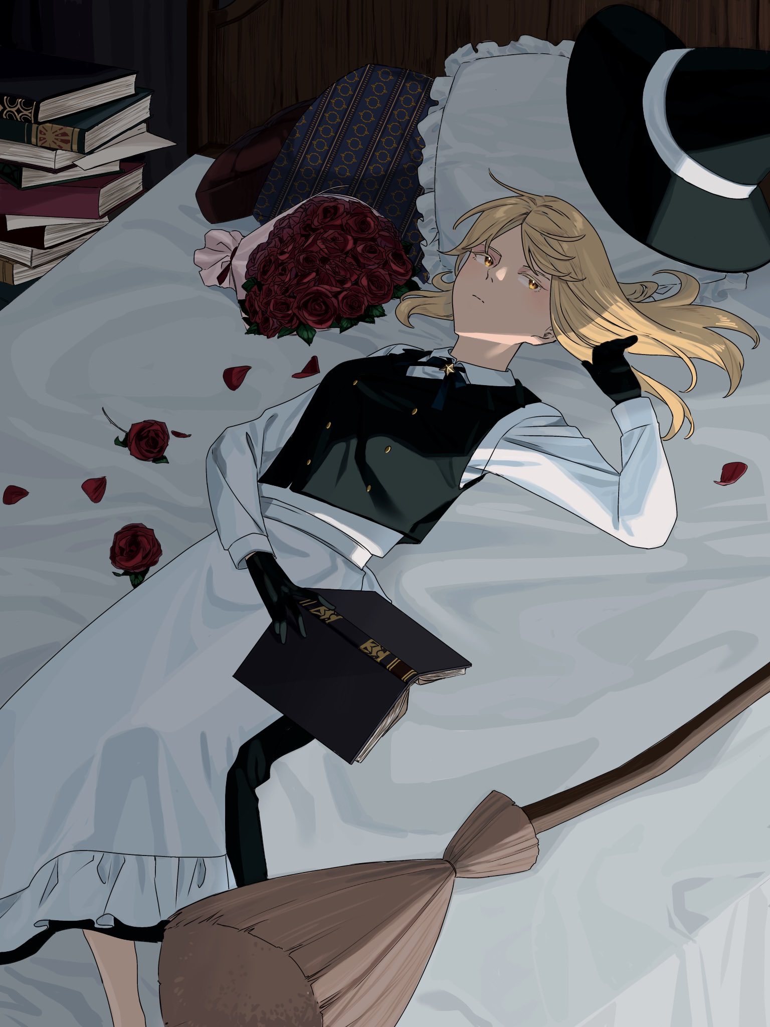 1girlapronblack glovesblack hatblack skirtblonde hairbouquetbroombuttonsdouble-breastedexpressionlessflowerga2hsemsmm65633gloveshatlong hairlooking at viewerlyingon backon bedpetalspillowred flowerred roseroserose petalsskirtsolounworn hatunworn headwearwhite apronwitch hatyellow eyes