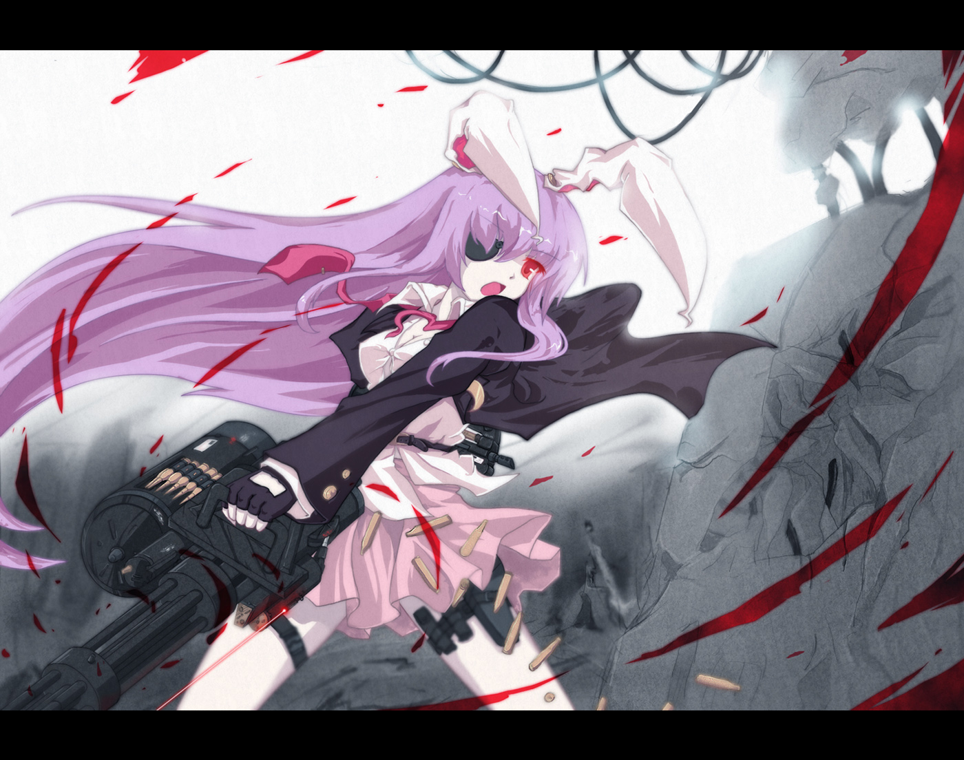 1girlanimal earsbloodbreastsbulletcleavageeyepatchfemale focusgatling gungunlarge breastsletterboxedlong hairmachine gunpurple hairrabbit earsred eyesskirtsolovery long hairweapon