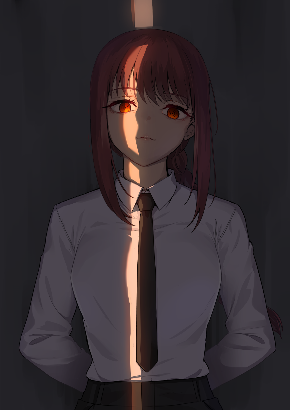 1girlarms behind backblack necktieblack pantsbraidbraided ponytailbreastscrack of lightlong hairlooking at viewermedium breastsnecktiepantsred hairringed eyesshirtshirt tucked insidelockssolovery long hairwhite shirt