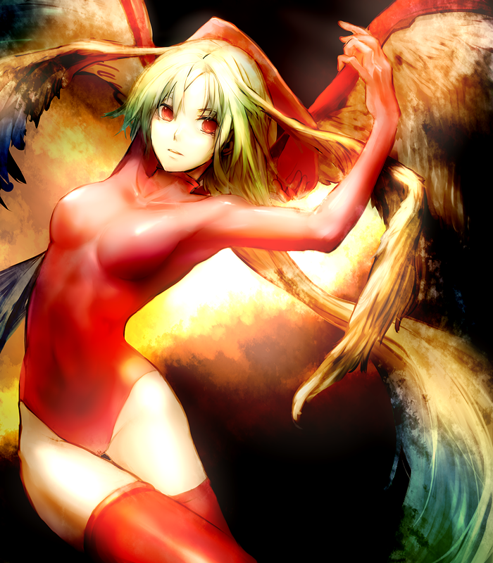 1girlangel wingsarched backarm behind headarmpitsarms upbodysuitbreastscollarbonecovered navelcowboy shotexpressionlessfeathersfemale focusglovesgroinhair wingshead wingshighleghighleg leotardhip focusleotardlooking at viewermedium breastsparted bangsred eyesred leotardshort hairskin tightsolothigh gapthighhighsturtleneckwhite hairwings