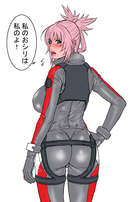 00s1girlassbackbiker clothesbikesuitblushbodysuitbreastscowboy shotcurvyfemale focusfrom behindgreen eyeshair uphand on own hiphip focushuge asslarge breastslipsticklong hairlooking backmakeupopen mouthpink hairsolosweatdrop