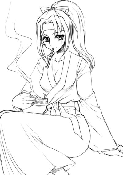 1girlbreastschopstickscleavagecupfemale focusgreyscalehair ribbonheadbandjapanese clotheskimonolarge breastslong hairmonochromemouth holdponytailribbonsittingsmilesolosteam