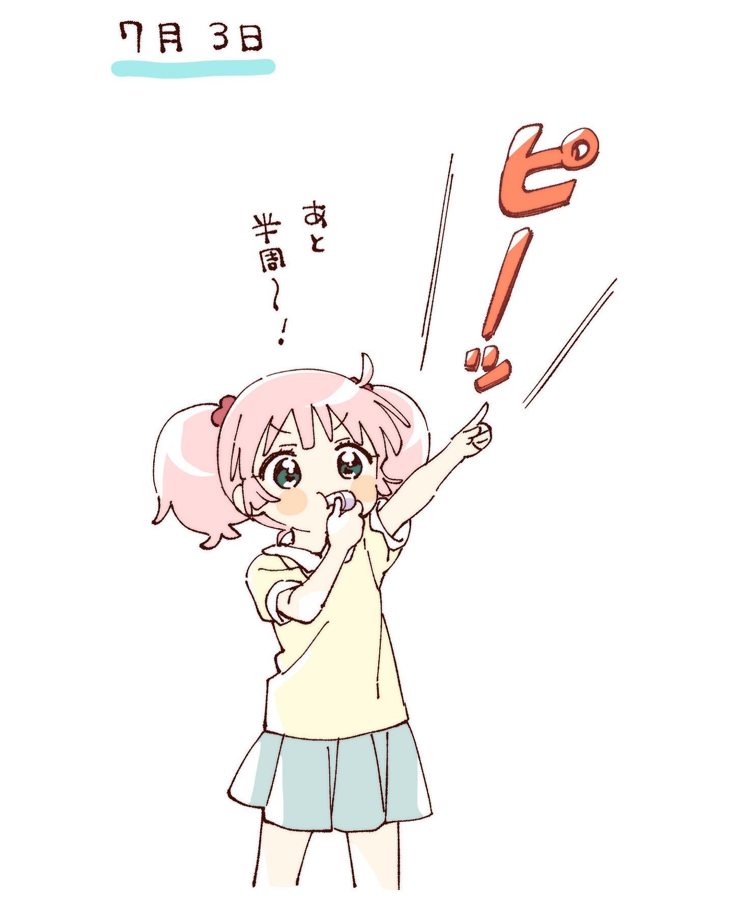 1girlblue skirtblush stickerscollared shirtcontrast collarcropped legsgreen eyeshair bobbleshair ornamentholdingholding whistlepink hairpleated skirtshirtshort hairshort sleevesshort twintailssimple backgroundskirtsolostandingtwintailsv-shaped eyebrowswhistlewhistlingwhite backgroundyellow shirt