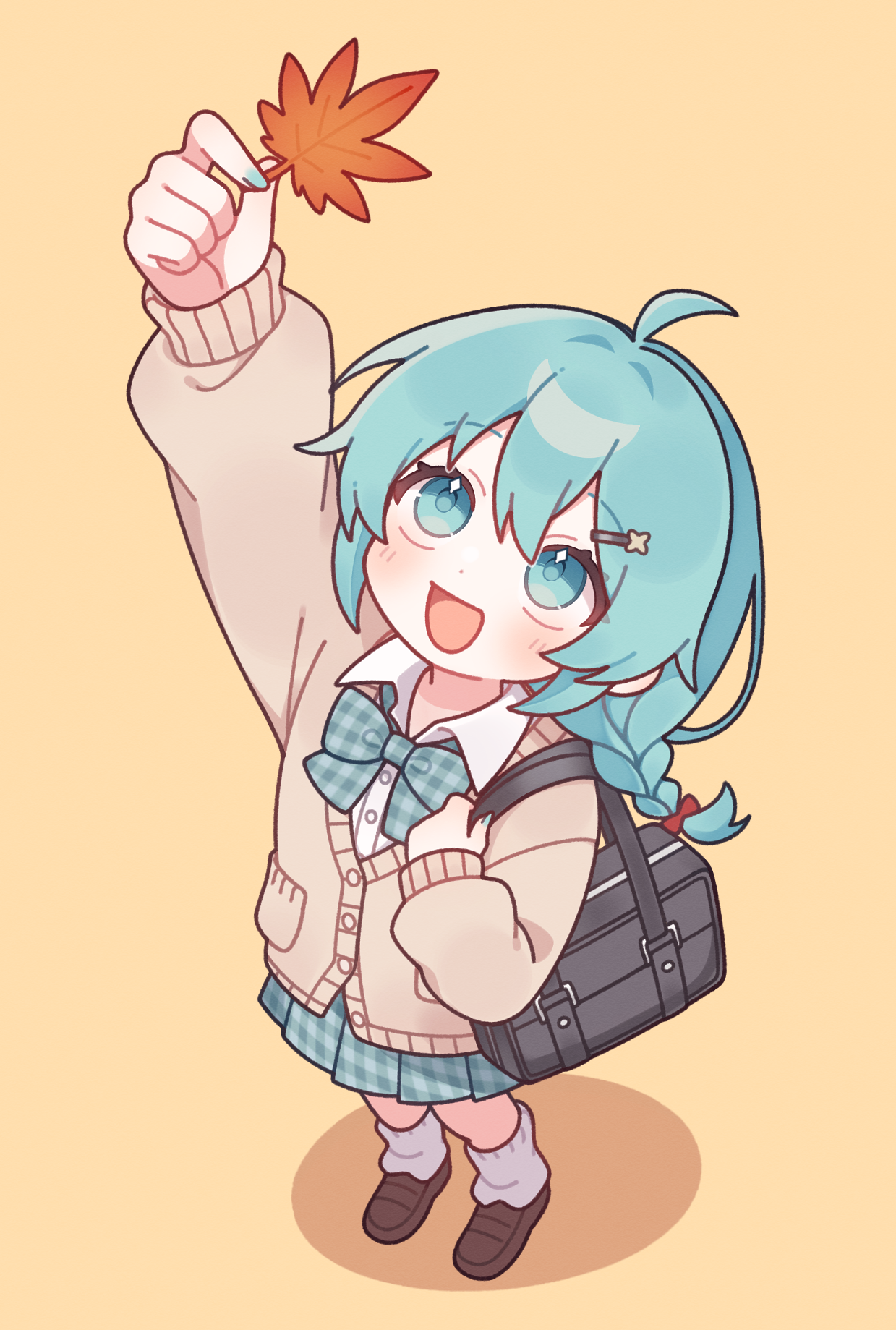 :d1girlalternate hairstylearm upbagblue eyesblue hairblushbowbowtiebrown cardiganbrown shoescardiganfull bodygreen bowgreen bowtiegreen skirthair between eyesholdingholding leafleaflong hairlong sleevesopen mouthplaid bowplaid bowtieplaid clothesplaid skirtpleated skirtschool bagschool uniformshoessimple backgroundskirtsmilesockssolostandingwhite sockswing collaryellow background