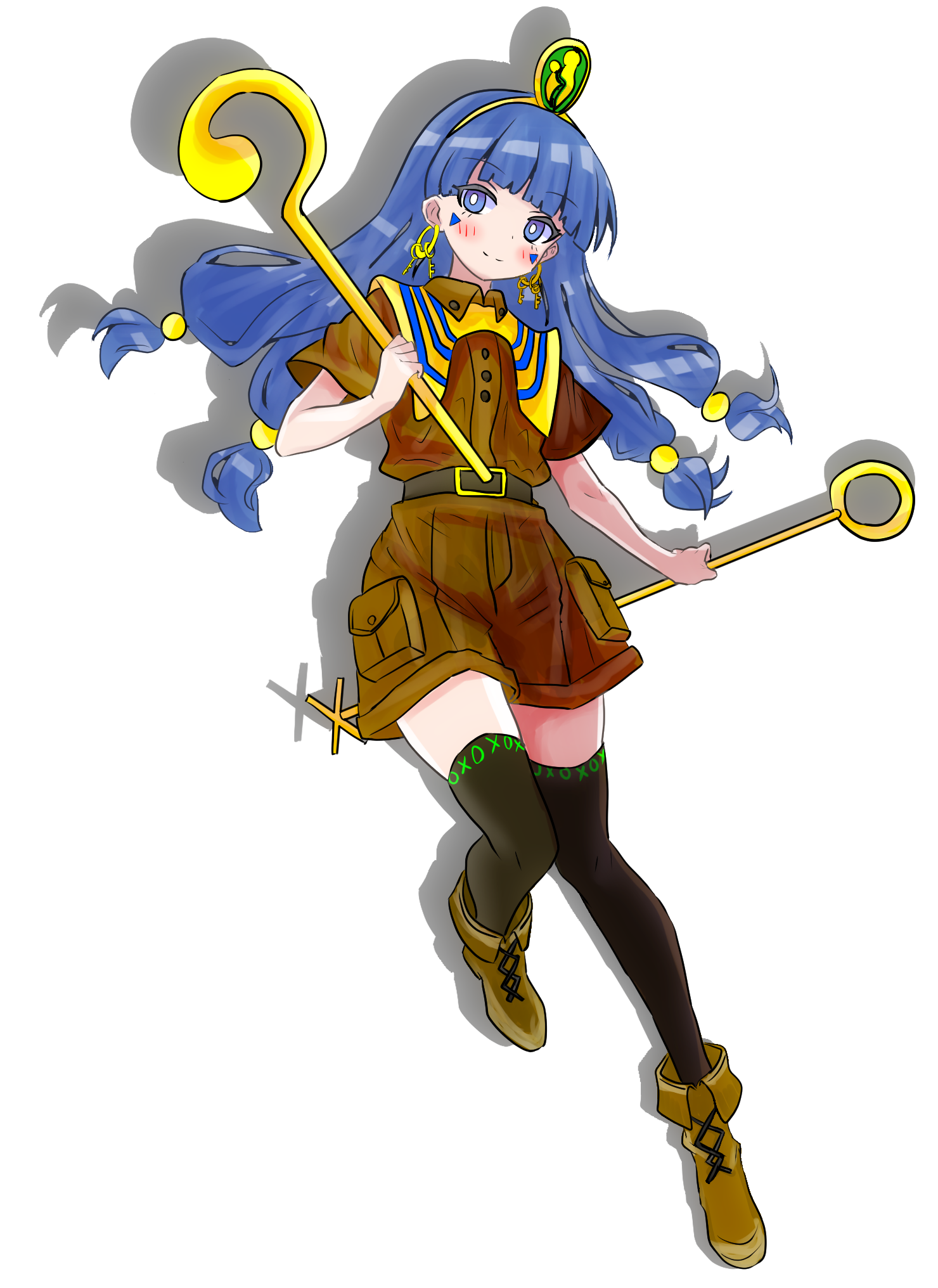 1girlafterimagebeltblack thighhighsblue eyesblue hairbootsbrown bootsbrown shirtbrown shortsearringsfacial markfull bodyhairbandholdingholding staffhoop earringsjewelrykaggoj5drr49868long hairlooking at viewershirtshortssolostaffthighhighs