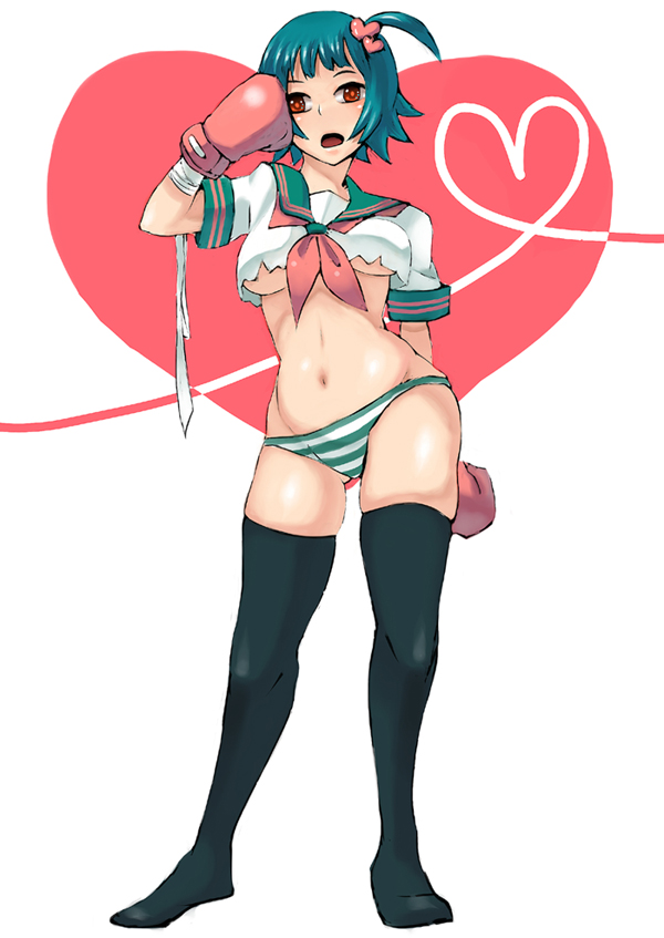 1girlbottomlessboxing glovesbreastscurvyfemale focusgreen hairnavelno pantsorange eyespantiesschool uniformserafukushort hairside ponytailsmall breastssolostriped clothesstriped pantiesthighhighstorn clothesunderboobunderwear
