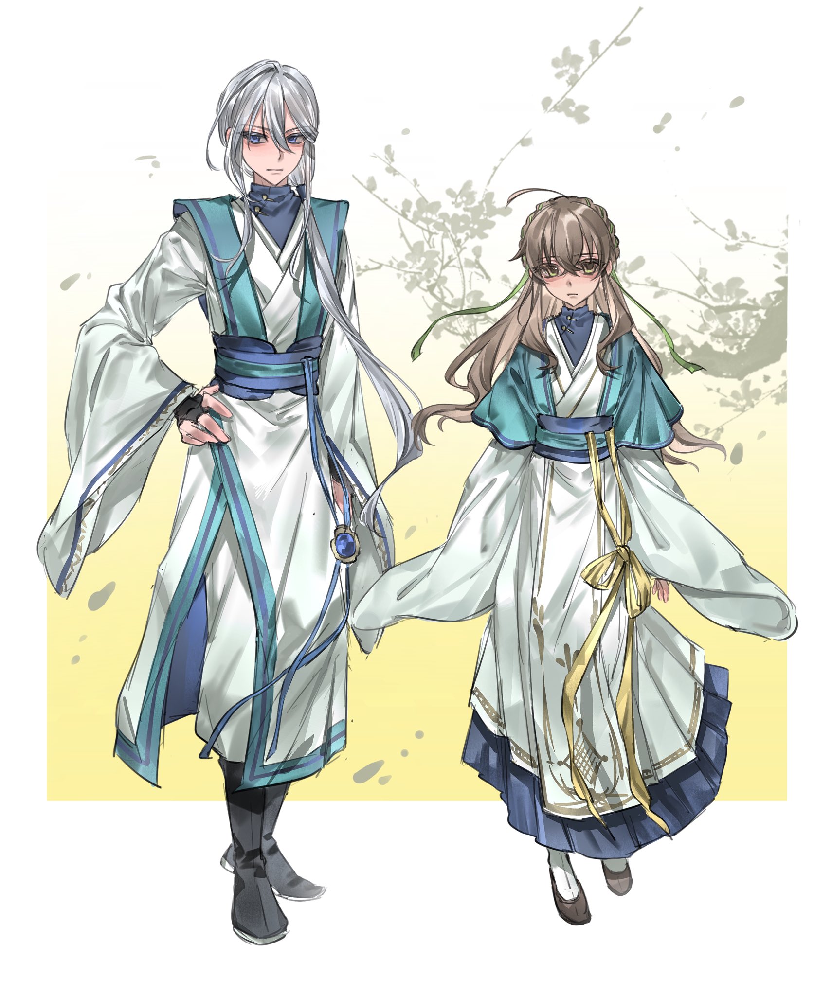 1boy1girlahogeamangjiablack bootsblue eyesbootsbraidbrown eyesbrown hairchinese clothesclosed mouthexpressionlesseyebrows hidden by hairflat chestfull bodyhair between eyeshand on own chestlong hairlooking at viewerwhite hair
