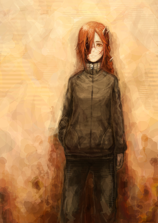 1girlbraidbrown backgroundbrown eyescolored skincross scarfemale focushair over one eyehornslong hairmonster girlmulticolored skinorange hairscarsingle braidsolosweaterturtlenecktwo-tone skin