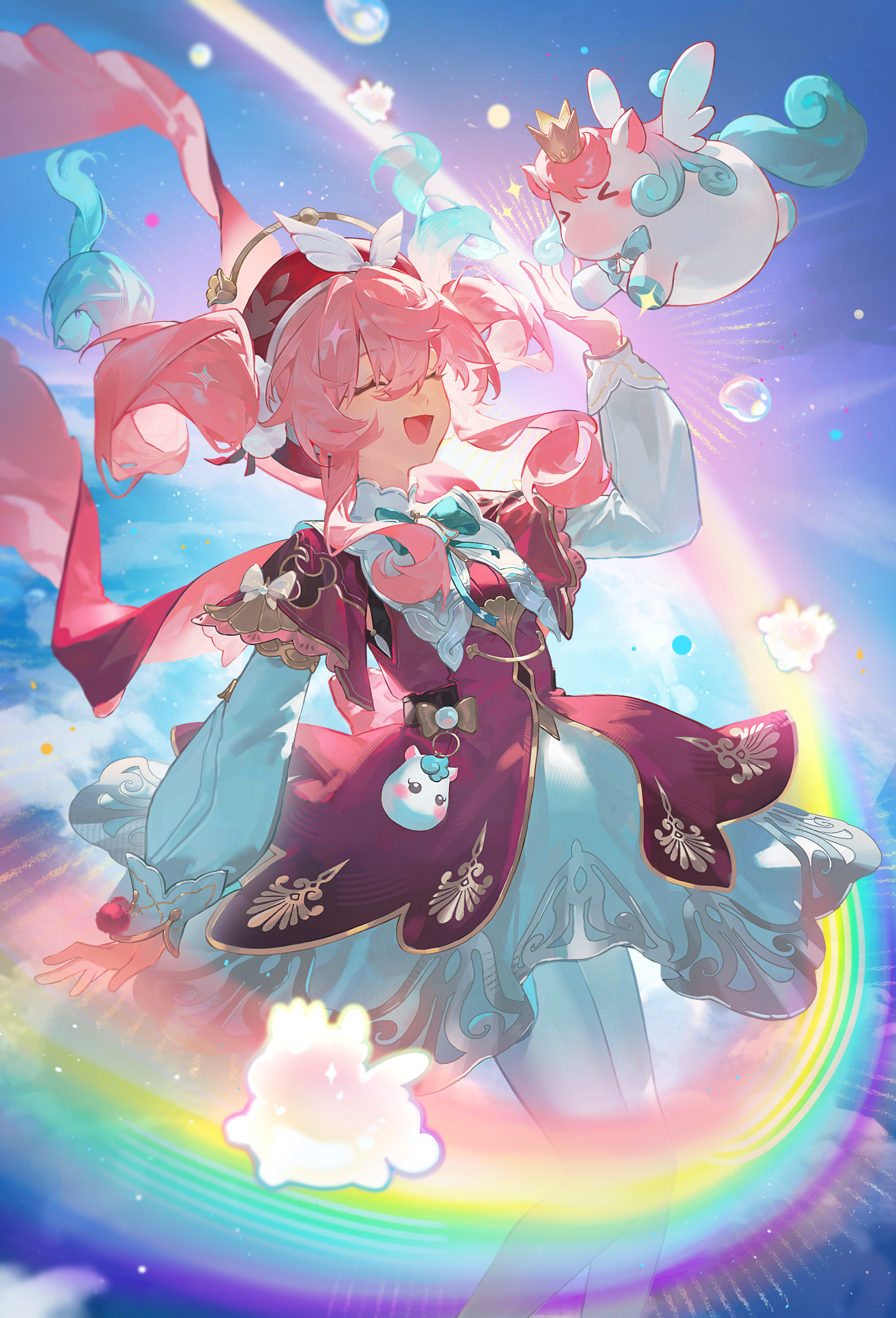 schnuz, fujiwara no mokou, hakurei reimu, hata no kokoro, kaenbyou rin, kirisame marisa, reiuji utsuho, toyosatomimi no miko, touhou, absurdres, commentary request, highres, +++, 6+girls, alternate costume, architecture, banner, black kimono, black wings, blonde hair, blue kimono, blue sash, blue scarf, body writing, bow, brown eyes, brown hair, circle, clenched teeth, closed eyes, cloud, cotton candy, display case, dress, earmuffs, east asian architecture, expressionless, falling leaves, feathered wings, fist pump, floral print, floral print kimono, food, frilled bow, frilled hair tubes, frills, grey hair, grin, hair bow, hair ears, hair tubes, hand fan, hane (hanetsuki), hanetsuki, holding, holding cotton candy, holding fan, holding food, holding paddle, ink on face, japanese clothes, kimono, leaf, long hair, mask, mask on head, multiple girls, new year, no headwear, o x, obi, okobo, paddle, pink hair, pink kimono, pink sky, pink socks, plaid clothes, plaid kimono, platform sandals, ponytail, print kimono, purple bow, red bow, red dress, red flag, red sash, red shoes, sandals, sash, scarf, shoes, shooting star (symbol), short sleeves, sky, smile, socks, spiral print, star (symbol), star print, sweatdrop, teeth, third eye, tile roof, wheelbarrow, white kimono, wings, x (symbol), yellow kimono, yin yang, yin yang print
