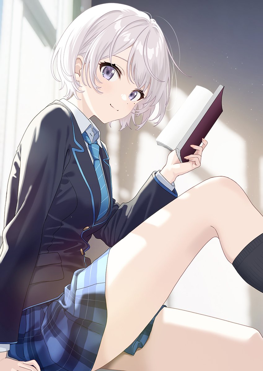 1girlblue skirtbookclosed mouthholdingholding booklooking at viewernecktiepurple eyesschool uniformshirtshort hairskirtsmilewhite hairwhite shirt