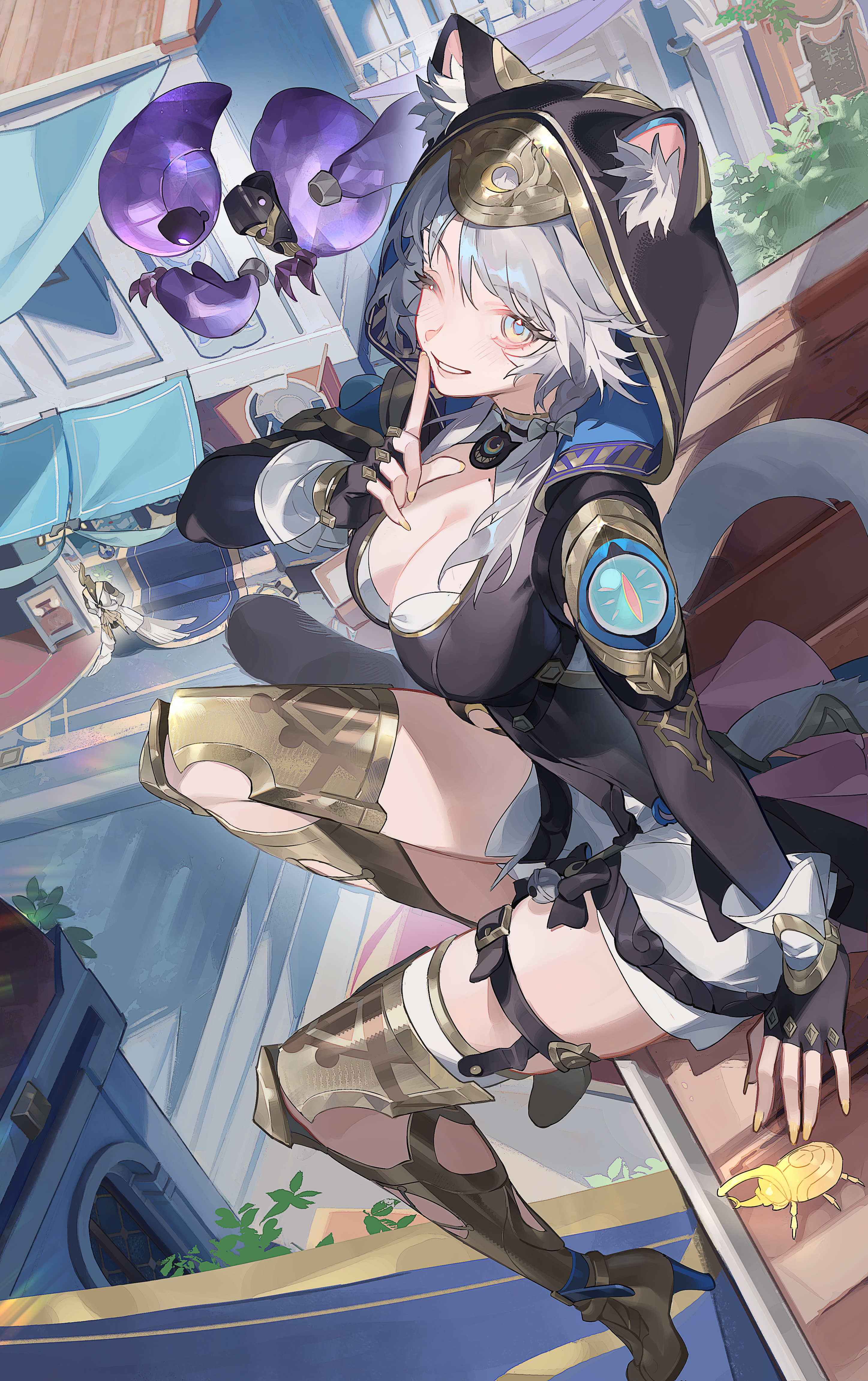 1girlanimal ear fluffanimal earsbeltblack glovesbowbreastscat earscat girlcleavagefinger to mouthfingerless glovesgarmentmaker (honkai: star rail)glovesgrey hairhair bowhigh heelsindex finger raisedlong sleeveslooking at viewermolemole on chestone eye closedoutdoorsparted lipsshushingsittingsmilesolothigh beltthigh strapyellow nails