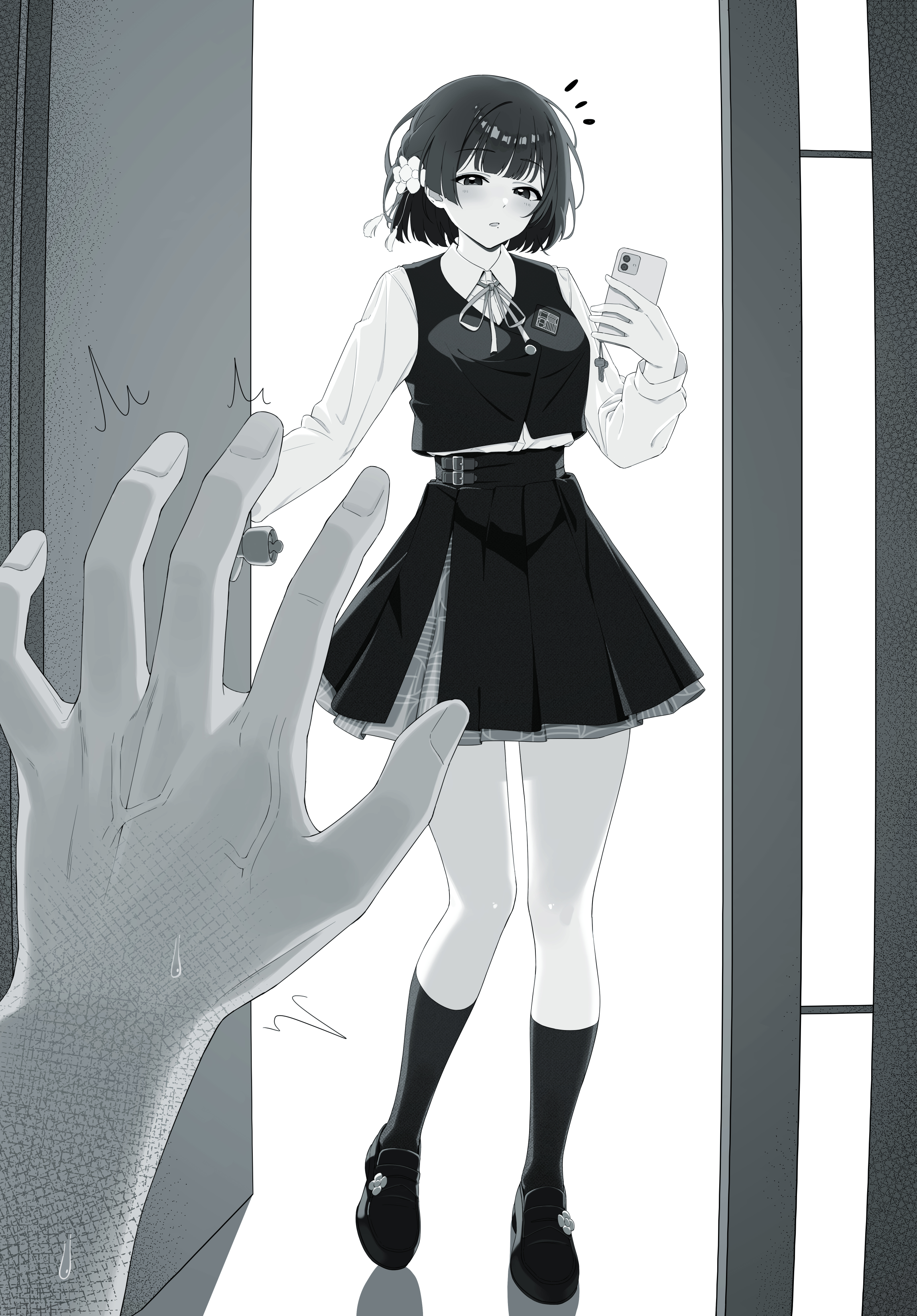 :o1boy1girlblunt bangsblushbreastscellphonedress shirtgreyscalehatsuboshi gakuen school uniformkeykneehighslooking at viewermedium breastsmolemole under mouthmonochromeneck ribbonnotice linesopen dooroverskirtphonepleated skirtpovpov handsribbonschool uniformshirtshort hairskirtskirt setsmartphonesocksveinsveiny hands