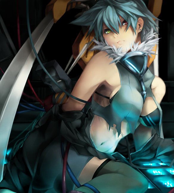aqua hairbracableearringsheterochromiajewelrylingerieshort hairsolothighhighstorn clothesunderwearzettai ryouiki