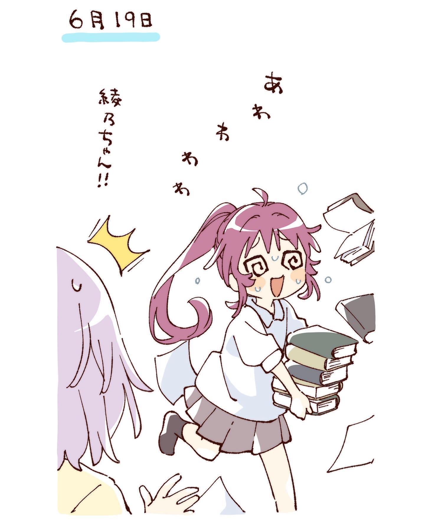 :d1boy2girlsahogeblack socksblush stickersbookbook stackcollared shirtcropped legsgrey hairgrey skirtholdingholding booklong hairmultiple girlsno shoesopen mouthpleated skirtponytailpurple hairshirtshort hairshort sleevessimple backgroundskirtsmilesocksspiral-only eyessweatwhite backgroundwhite shirt