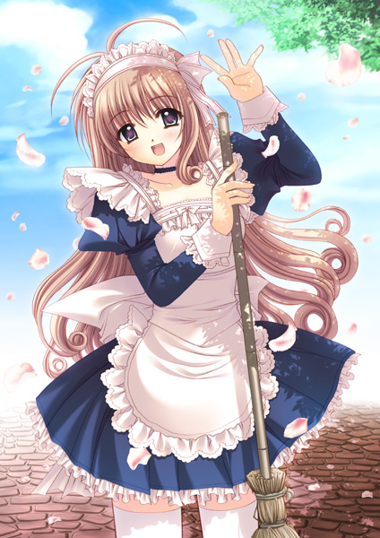 broombrown haircherry blossomsfrillslong hairmaidopen mouthpetalspurple eyessolothighhighswaving