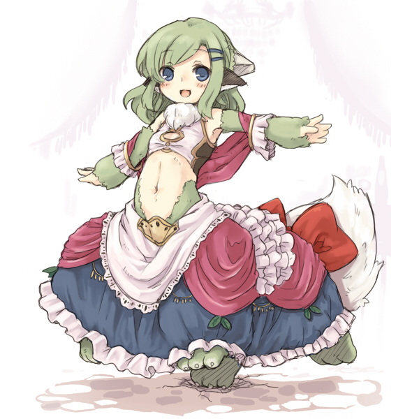 1girlanimal earsarmpitsblue eyesblushcentauroidcrackdressfemale focusflat chestgreen hairgrey hairhair ornamenthairclipmidriffmonster girlnavelrabbitshort hairsolotailtaur