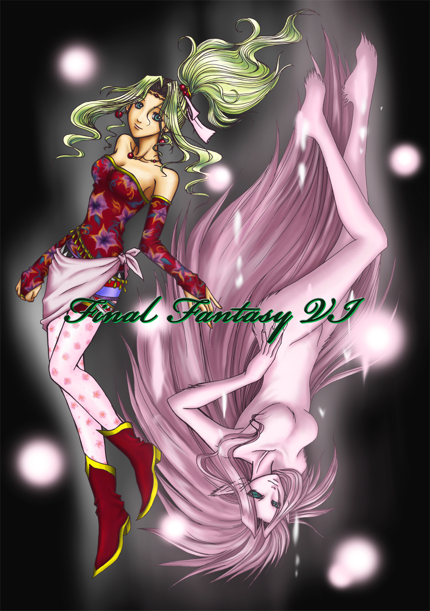 1990s (style)2girlsbare shouldersblue eyescopyright namedetached sleevesdual personagreen hairhypnosislong hairmultiple girlsno nipplespantyhosepointy earsponytailvery long hair