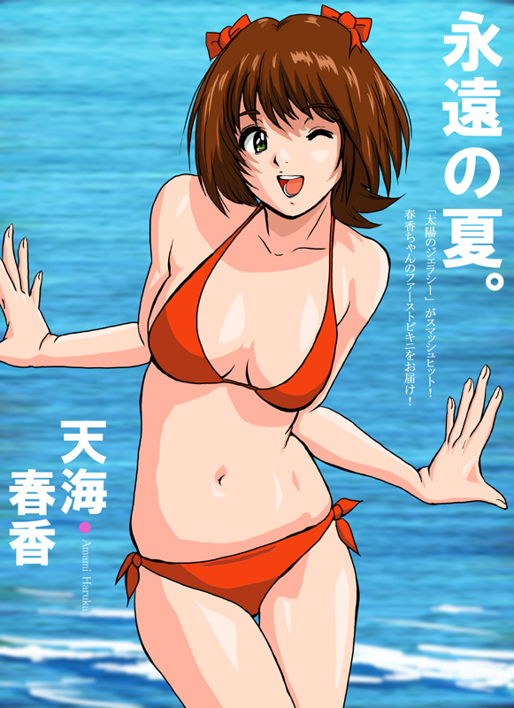 zerock692, wendy corduroy, gravity falls, commentary, english commentary, highres, 1girl, ass, ass freckles, body freckles, breast freckles, breasts, cleavage, closed mouth, earrings, feet up, freckles, green eyes, jewelry, lifeguard, long hair, looking at viewer, lying, medium breasts, official alternate costume, on stomach, red hair, shoulder freckles, simple background, smile, solo, the pose, thighs, twitter username