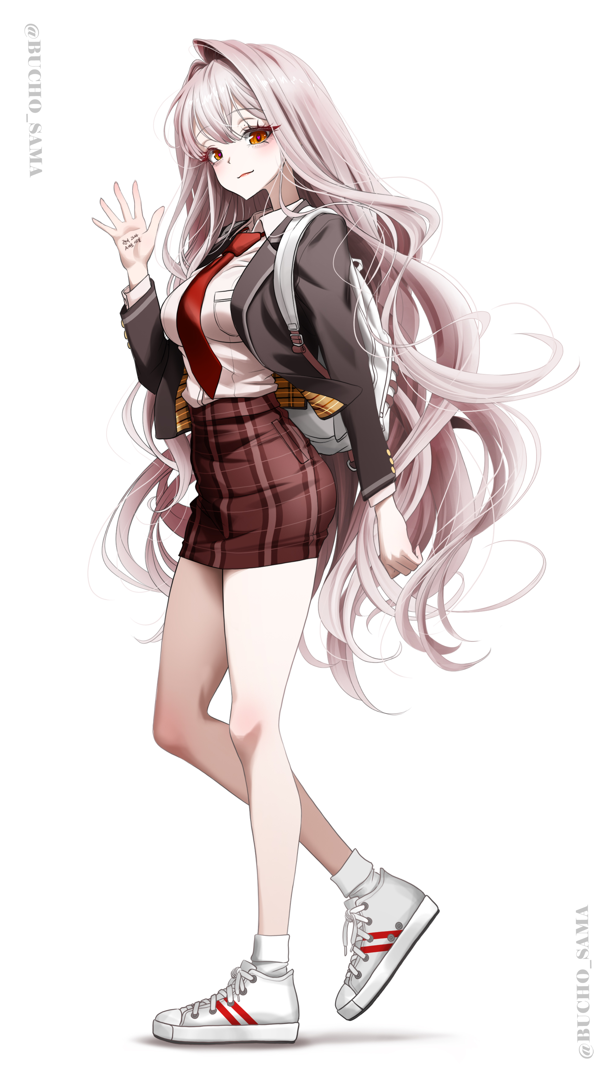 1girlalternate costumeblack jacketblushcollared shirtjacketlong hairlooking at viewerminiskirtnecktieopen handpink hairplaid clothesplaid skirtred eyesred necktiered skirtshirtshoesskirtsneakerssockssolotight clotheswhite shirtwhite shoeswhite socks