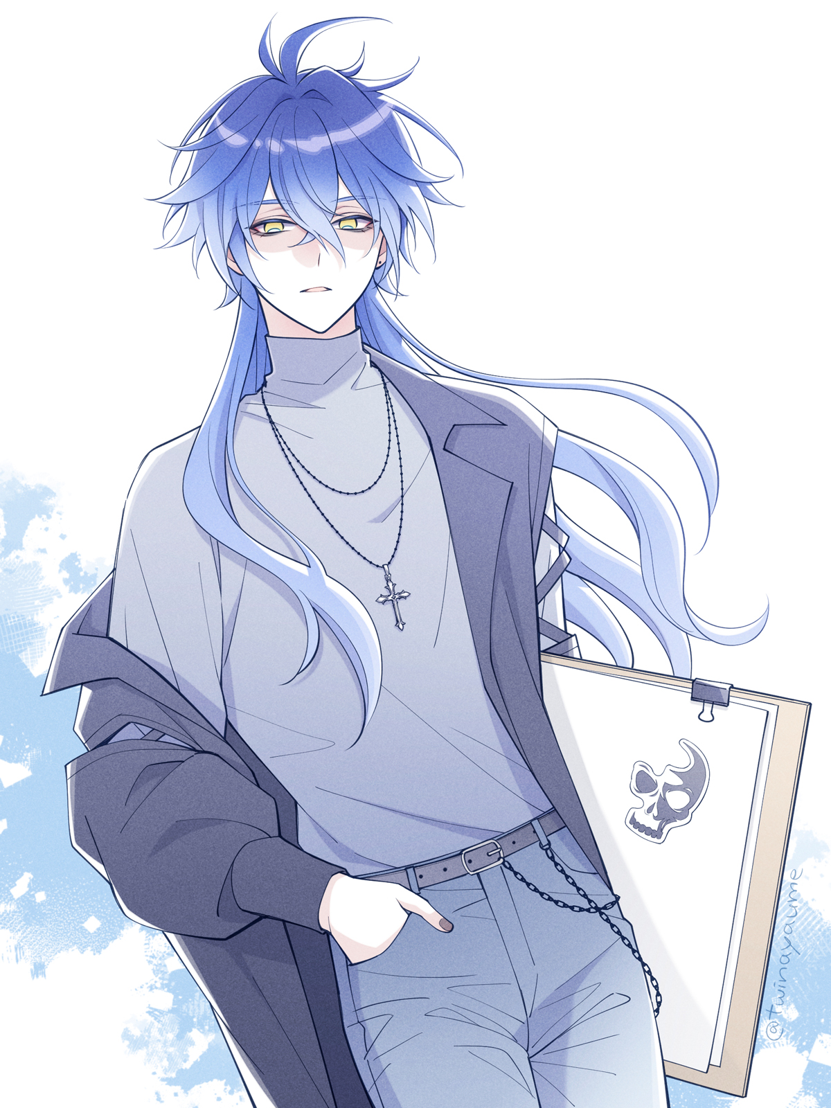 1boyantenna hairbeltblack beltblack jacketblue hairblue pantscasualcrossed bangsdenimdouble-parted bangseaselempty eyesfloating hairgrey shirthair between eyeshand in pocketholdingjacketjeanslong hairlong sleeveslooking to the sidemale focusnail polishopen clothesopen jacketpantsparted lipsshirtshirt tucked insoloturtleneckvery long hairwhite backgroundyellow eyes