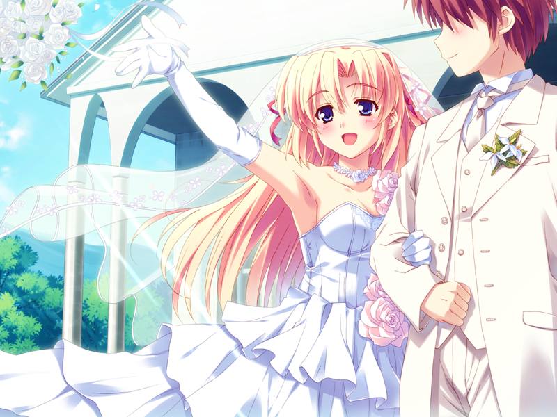 1boy1girlarmpitsblonde hairblue eyesbridal veilbridedresselbow glovesflowerglovesholding another's armlong hairveilwedding dress