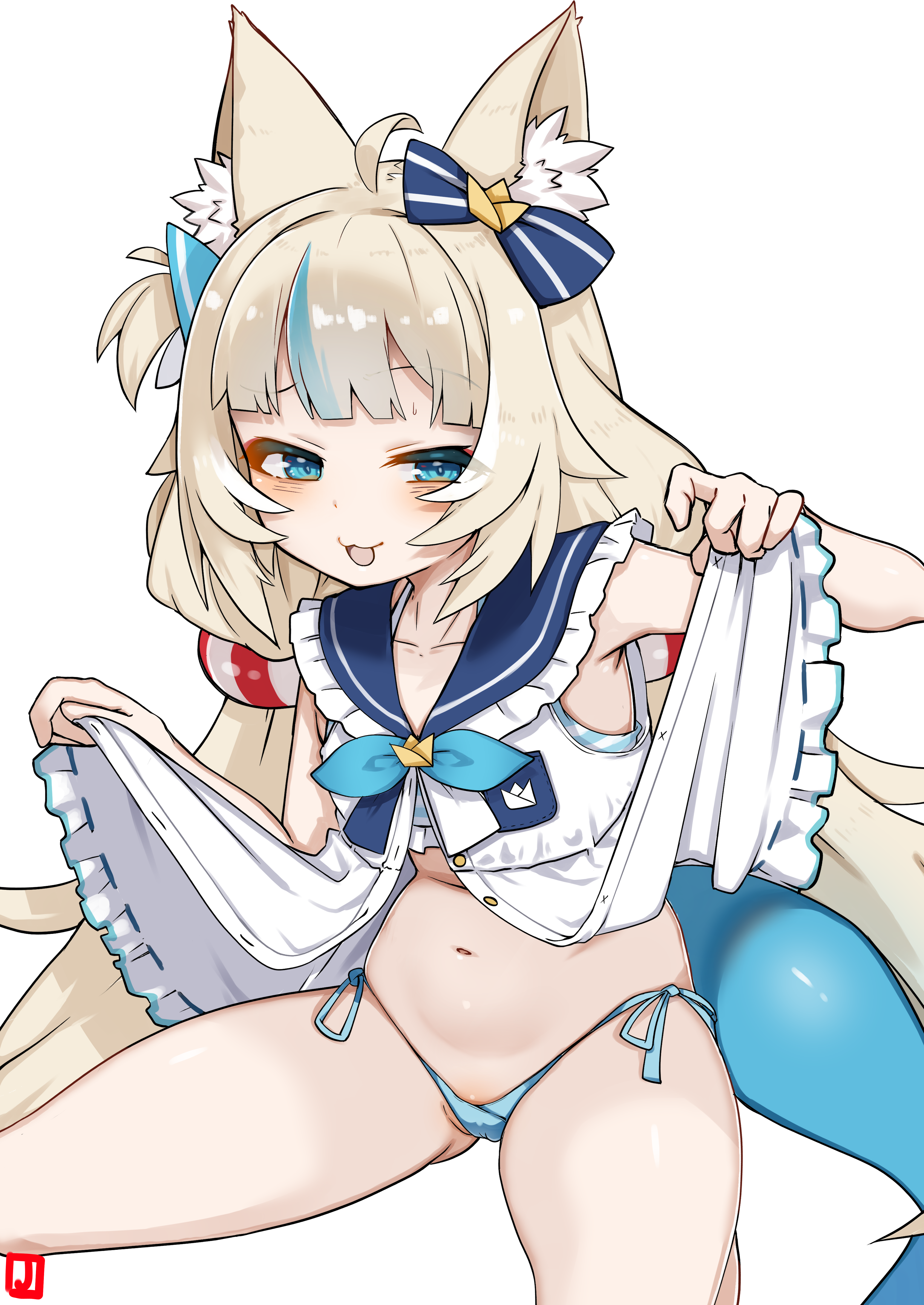 1girlanimal ear fluffanimal earsbikiniblonde hairblue bikiniblue bowblue eyesblue hairblue sailor collarbowcameltoecat earsclothes liftcollarbonedressdress liftfinsfish girlfish tailfrilled dressfrilled sailor collarfrillshair bowlifebuoy hair ornamentlolilong hairlooking at viewerlow twintailsmulticolored hairnavelone side upopen clothesopen dressopen mouthsailor collarside-tie bikini bottomsimple backgroundsolostreaked hairstriped bikinistriped clothesswimsuittailtwintailswhite backgroundwhite dress