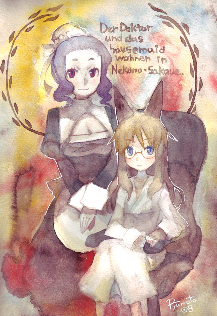2girlsanimal earsblue eyesbrown hairgerman textglasseslong hairmaidmultiple girlsranguagered eyessitting