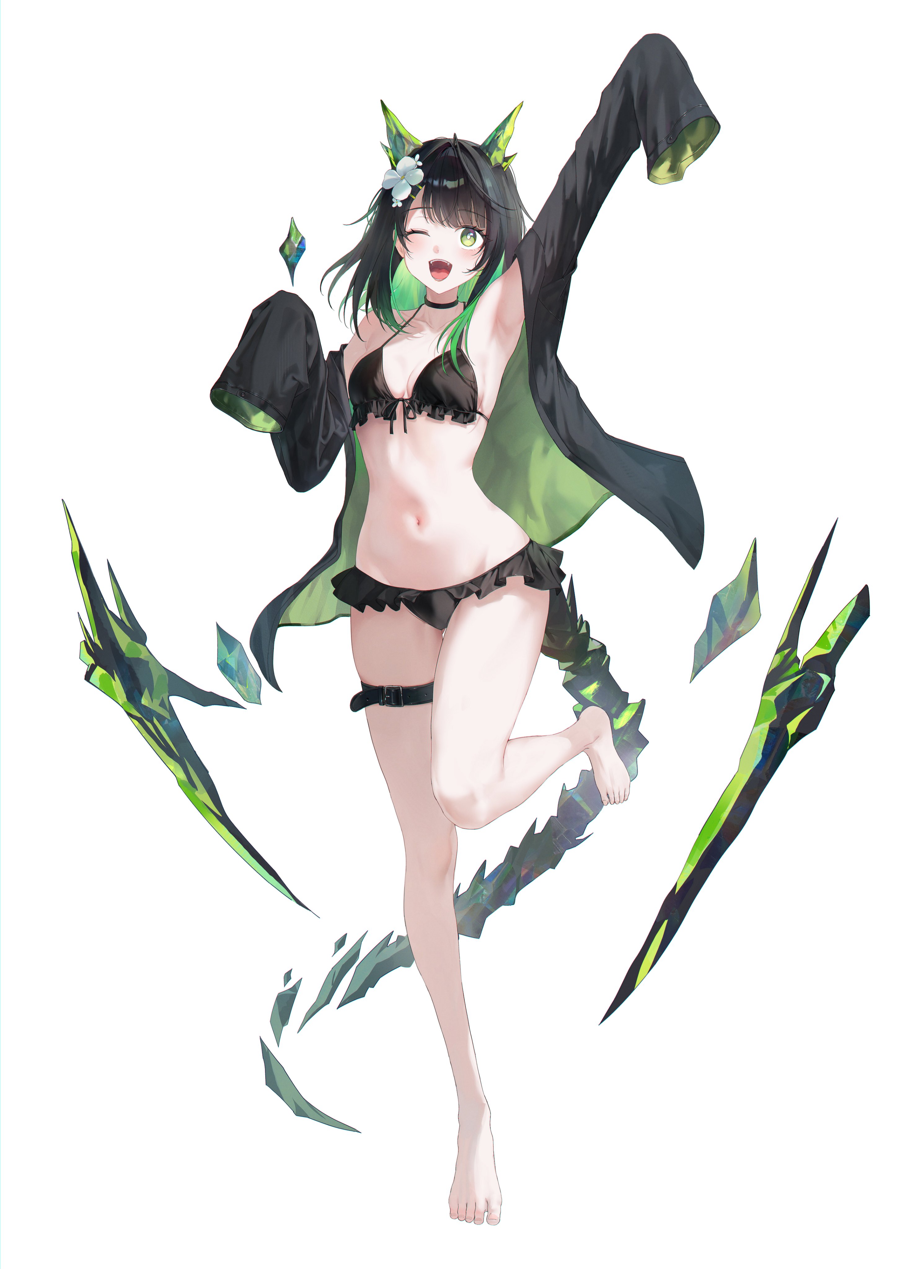 :d1girlahogealternate costumeanimal earsarm uparmpitsbikiniblack bikiniblack chokerblack hairblunt bangsblushbreastschokercolored inner hairfake animal earsfangflowerfoot out of framefrilled bikinifrillsfront-tie bikini topfront-tie topfull bodygreen eyesgreen hairhair flowerhair ornamenthappylong sidelockslooking at viewermedium hairmulticolored hairone eye closedopen mouthparted bangssidelockssimple backgroundskindentationsleeves past wristssmall breastssmilesolostandingstanding on one legswimsuitswimsuit cover-uptailthigh straptwo-sided fabricwhite background