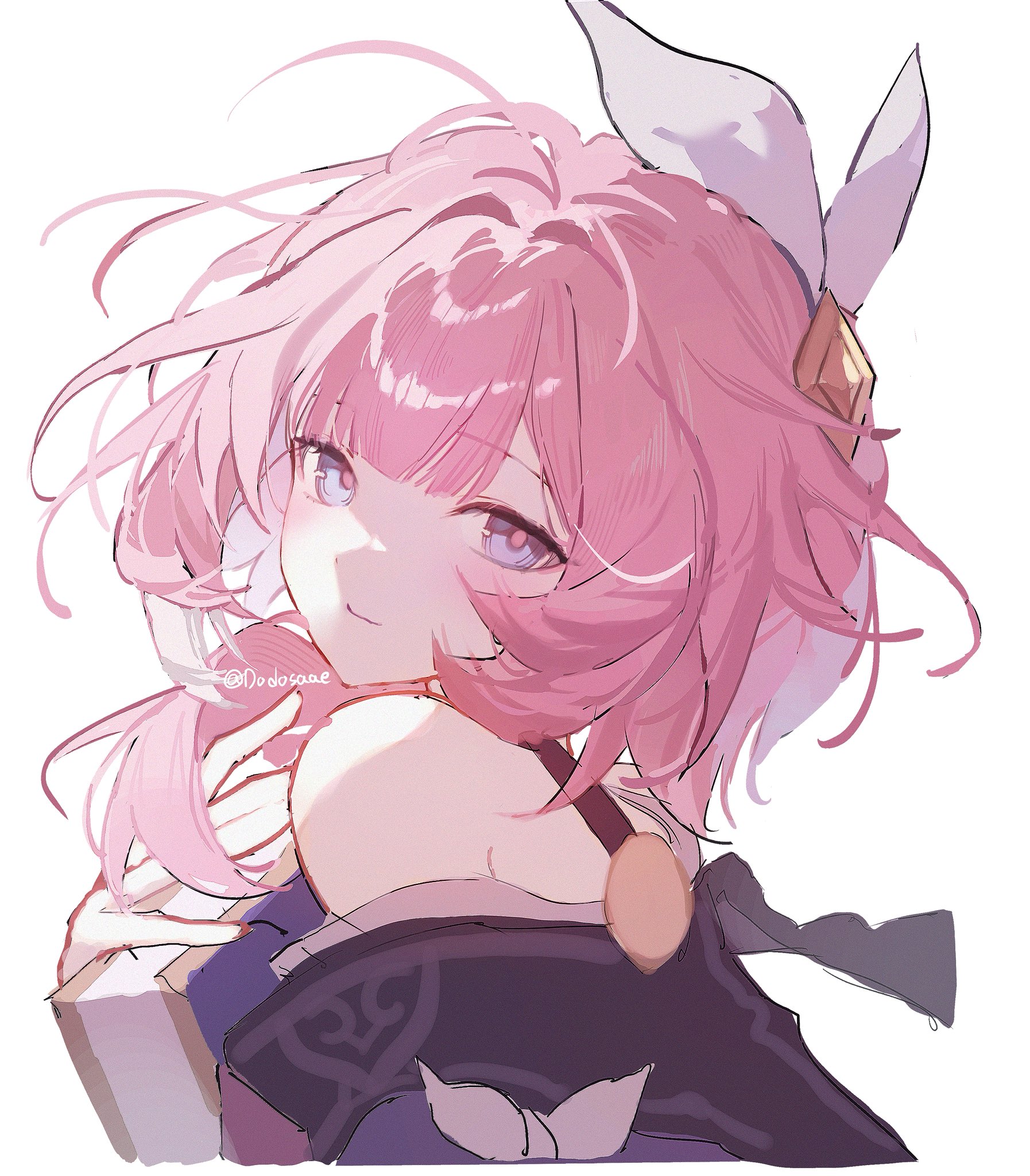 1girlblue eyesbookcoatcyrene (aedes elysiae) (honkai: star rail)dodosaaefrom sidehair ornamentholdingholding booklooking at viewerpink hairpurple coatshort hairsimple backgroundsmilesoloupper bodywhite background