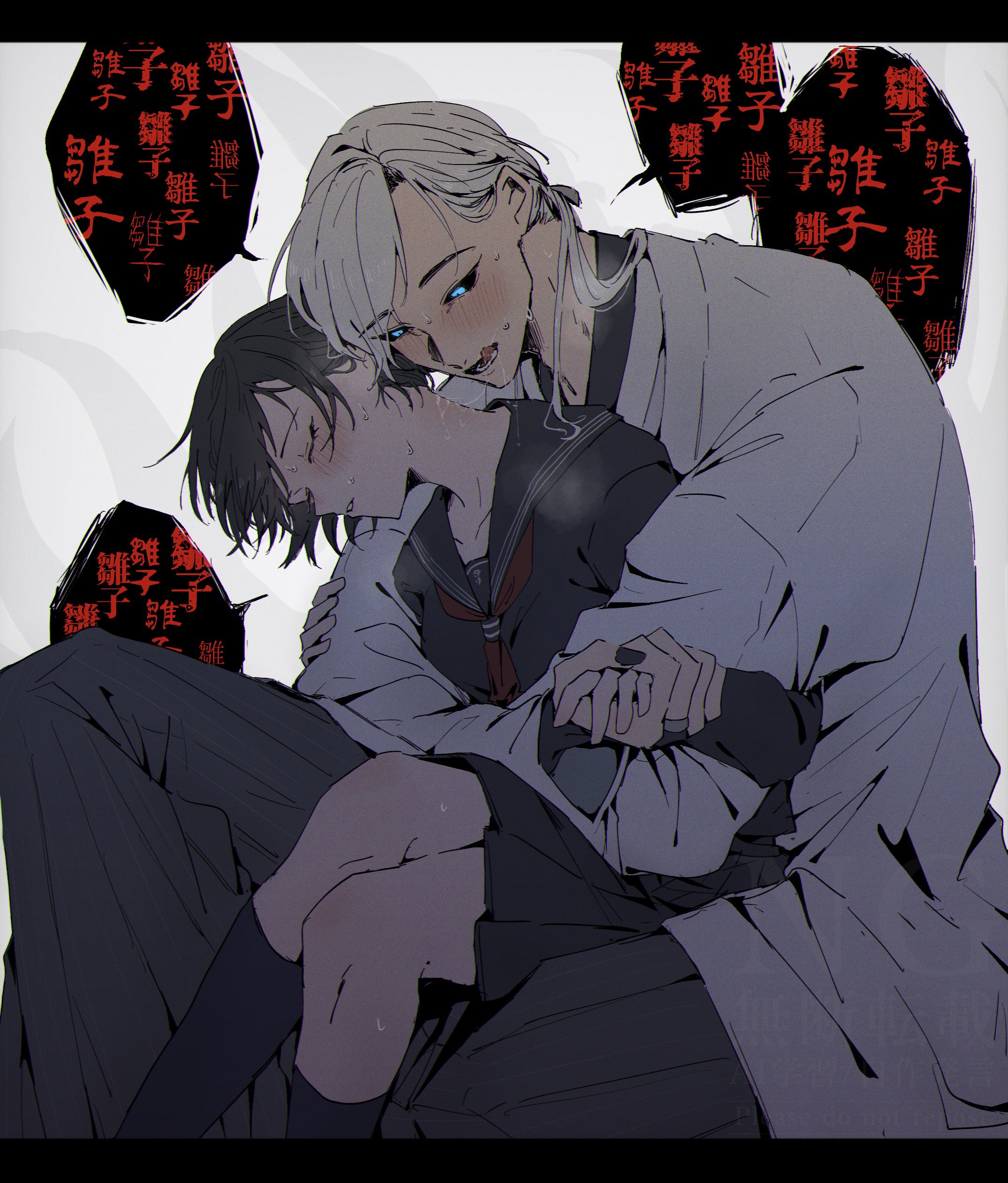 1boy1girlblack hairblack sailor collarblack sclerablack socksblue eyesclosed eyescolored scleraholding another's waistholding handsjapanese clotheskimonolong hairneckerchiefred neckerchiefrobesailor collarsalivasaliva trailschool uniformsimple backgroundsittingsitting on lapsitting on personsocksspeech bubblesweattonguetongue outwhite backgroundwhite hairwhite kimonowhite robe