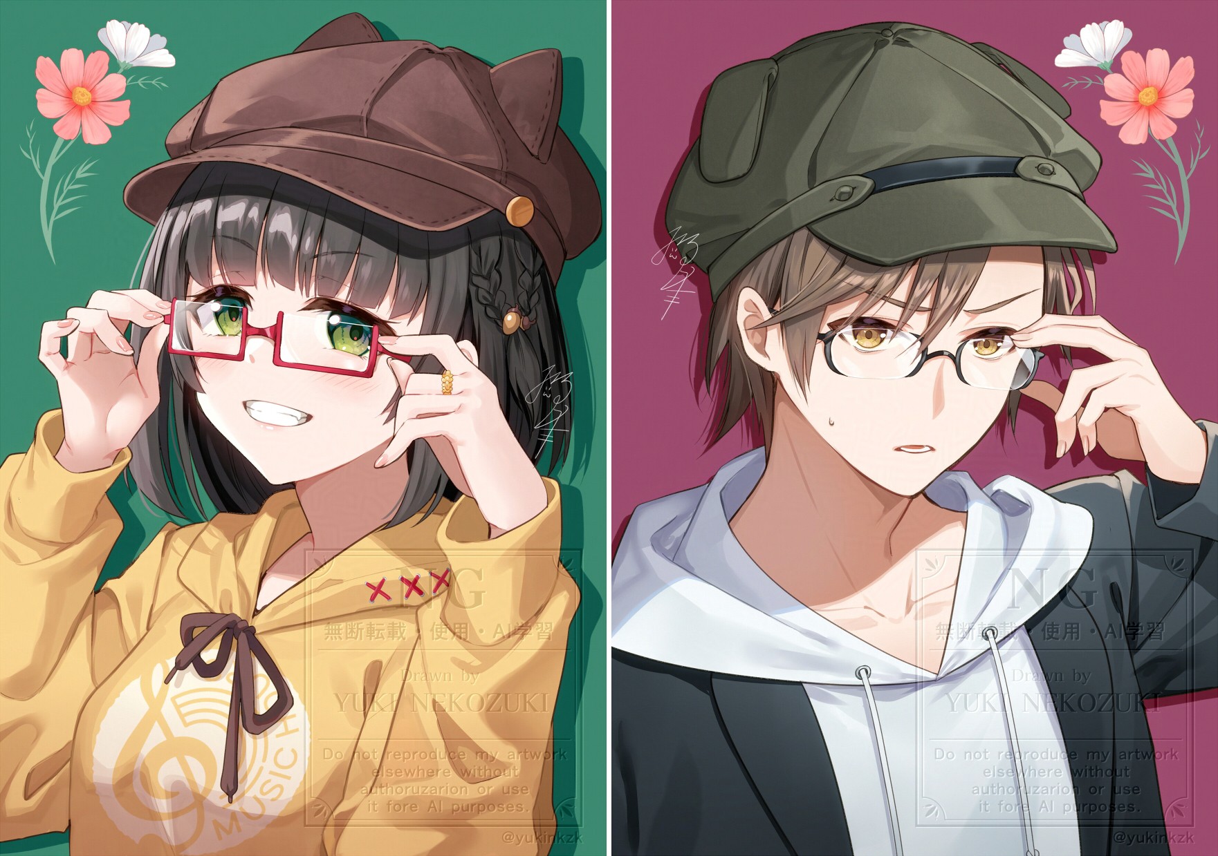 1boy1girlanimal earsanimal hatblack hairblack jacketblack-framed eyewearbrown eyesbrown hairbrown hatbrown hoodiecat earsdog earsfake animal earsglassesgreen eyesgrinhathoodhood downhoodiejacketlong sleevesnewsboy capopen clothesopen jacketparted lipspuffy long sleevespuffy sleevesred-framed eyewearsemi-rimless eyewearsignaturesmall sweatdropsmilesweatunder-rim eyewearupper bodywatermarkwhite hoodie