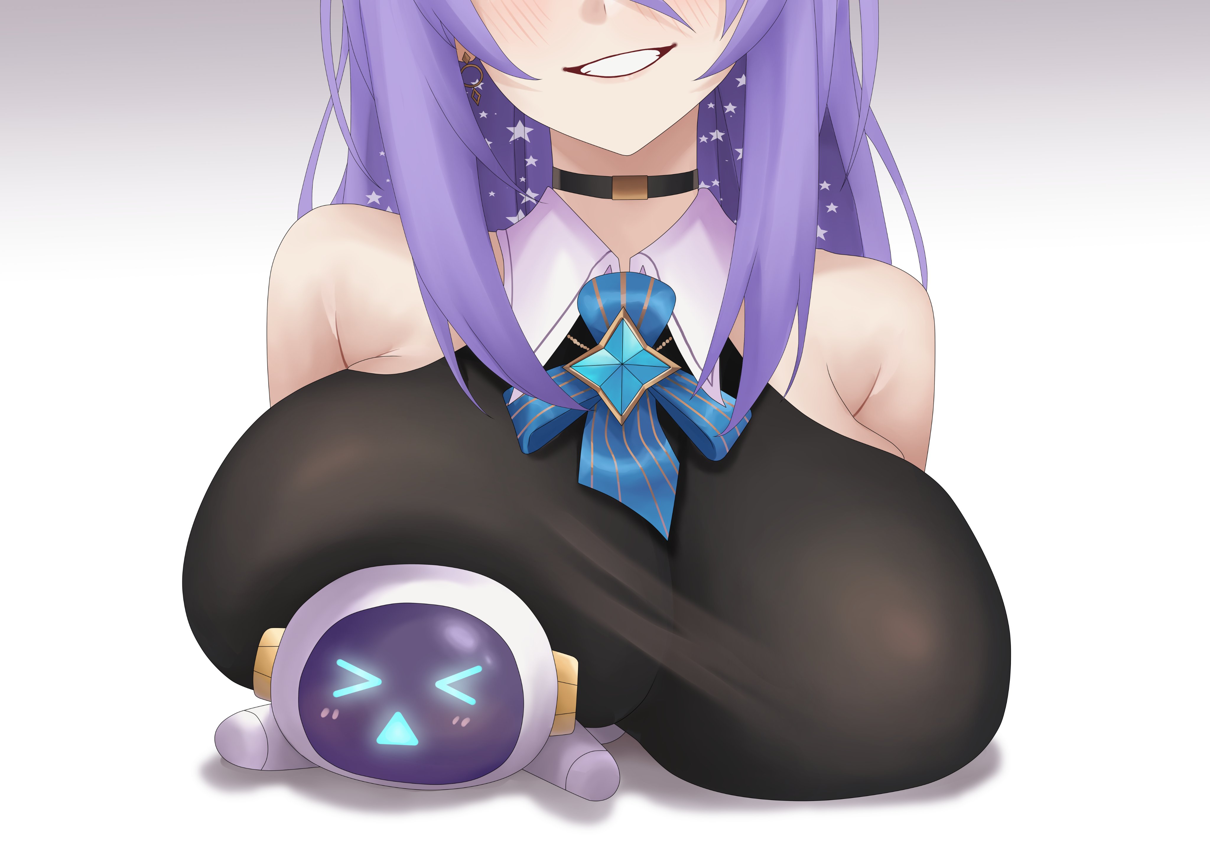 1boy1girlbreast focusbreast restbreastsbreasts on headbreasts on tablecrushedcrushingeyes out of framehead out of framelong hairmememisanay1 breast rest (meme)moonabito (moona hoshinova)multicolored hairpurple eyespurple hairsmilesolostarry hairvirtual youtuber