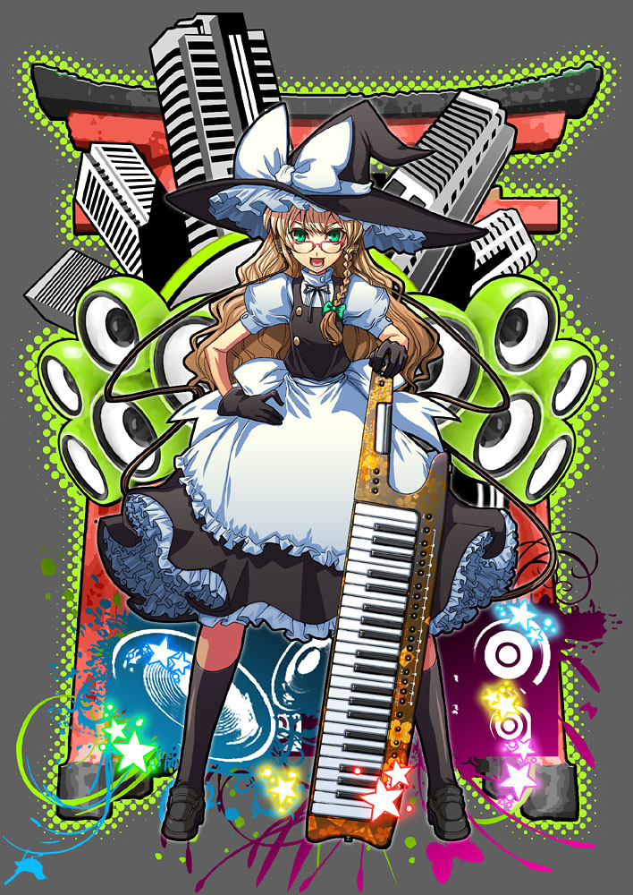 1girlblonde hairbraidfemale focusfull bodyglassesglovesgreen eyeshalftonehalftone backgroundhatheadphonesinstrumentkeyboardkeytarlong hairsolospeakerwitchwitch hat