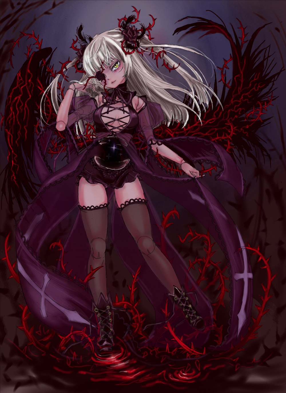 1girlbootsbreastscosplaydoll jointseyepatchfemale focusflowerfusionjointslong hairmedium breastsrosesee-through clothessolosuigintou (cosplay)thighhighsthornswhite hairyellow eyeszettai ryouiki