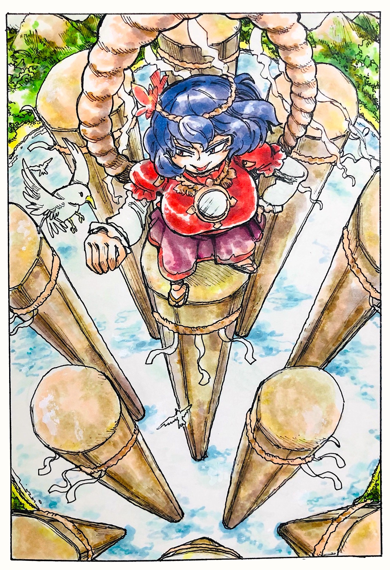 1girlbirdblue hairborderbreastsforeshorteningfrilled sleevesfrillshair ornamenthand on own hiplarge breastslayered sleevesleafleaf hair ornamentlong sleeveslooking at animalmaple leafmedium hairmirrormountainonbashiraoutdoorsperspectivepurple skirtred shirtropesandalsshimenawashirtshort over long sleevesshort sleevesskirtsmilesolostandingwaterwhite border