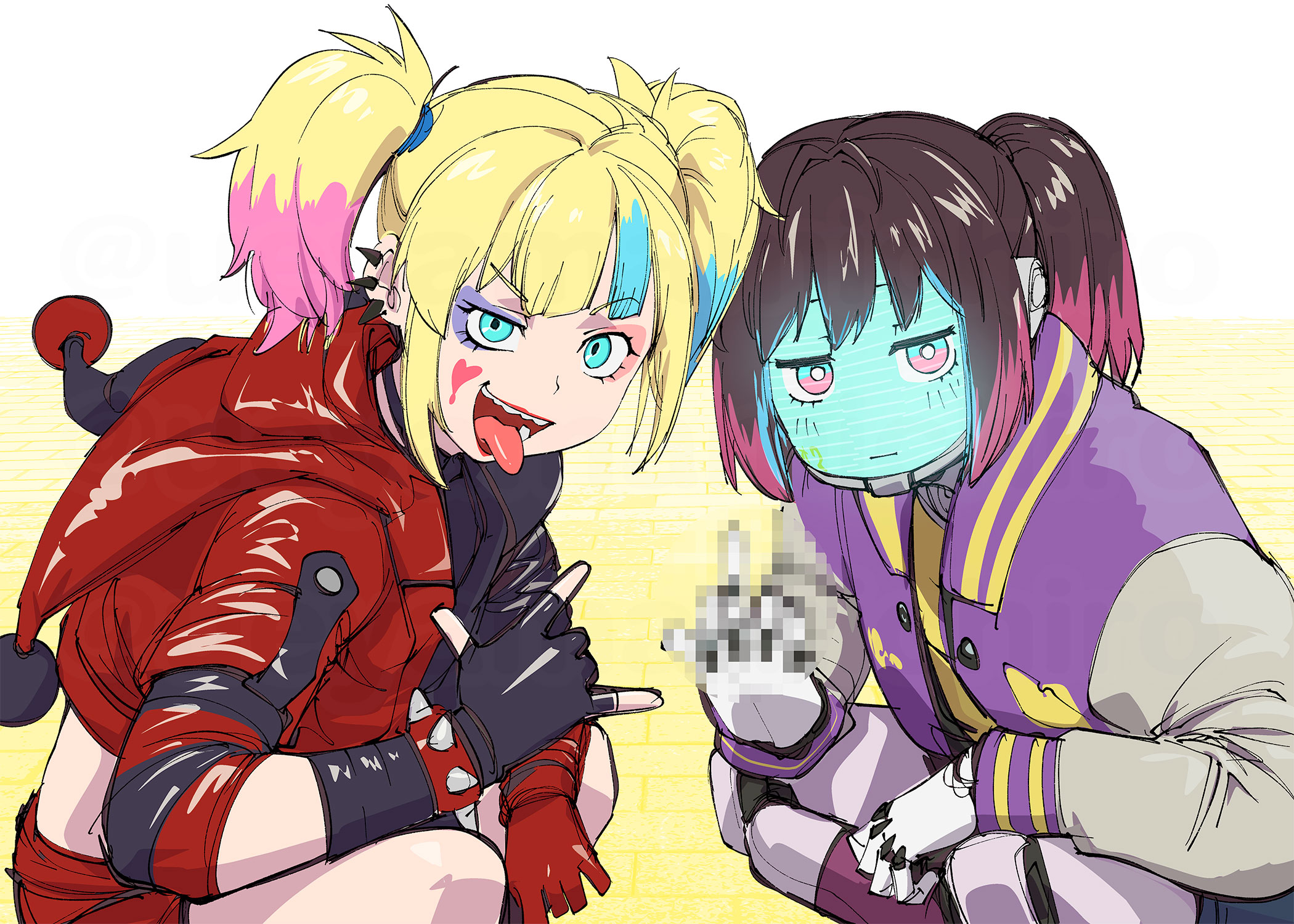 puyurin, aventurine (boss) (honkai: star rail), aventurine (honkai: star rail), stelle (honkai: star rail), trailblazer (honkai: star rail), honkai: star rail, honkai (series), 1boy, 1girl, ankle grab, artist name, black boots, black gloves, black hat, black jacket, black mask, black skirt, blonde hair, blue boots, boots, claws, closed mouth, covered face, fighting, floating clothes, frills, fur-trimmed jacket, fur trim, gloves, grey hair, hat, jacket, long hair, long sleeves, lying, miniskirt, no eyes, official alternate costume, on back, open clothes, open jacket, shadow, shirt, short hair, skirt, t-shirt, thigh boots, thigh strap, top hat, white background, white shirt