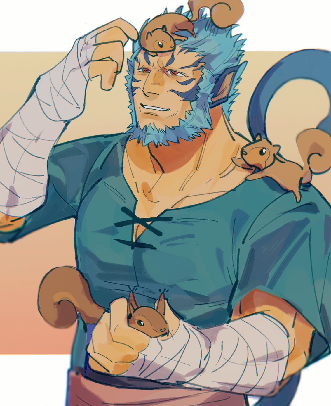 1boyanimalanimal earsanimal on handanimal on headanimal on shoulderbeardblue hairfacial hairmale focuson headon shouldershort hairsquirreltail