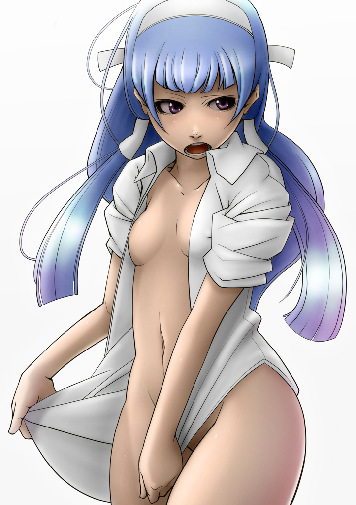 00s1girlblue hairblunt bangscovering crotchcovering privatesfemale focushair tubeslong hairno brano pantiesopen clothesopen shirtpurple eyesshirtsolo
