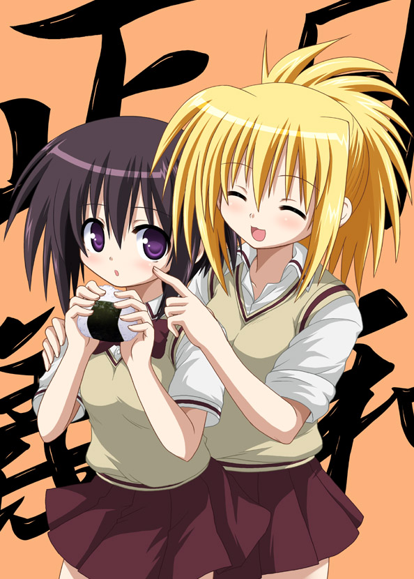 okuda yasuhiro, signum, yagami hayate, lyrical nanoha, mahou shoujo lyrical nanoha, mahou shoujo lyrical nanoha a's, megami deluxe, megami magazine, grey legwear, highres, official art, scan, 00s, 2girls, :d, age difference, ankle socks, arm around neck, asymmetrical docking, blue eyes, blush, braid, breast press, brown hair, carrying, eye contact, flat chest, hair between eyes, hair ornament, hair ribbon, hairclip, hand on another's chest, indoors, long hair, looking at another, miniskirt, multiple girls, open mouth, panties, pantyshot, pink hair, pink panties, ponytail, popped collar, princess carry, ribbon, shirt, short hair, side braid, skirt, smile, socks, standing, underwear, upskirt, very long hair
