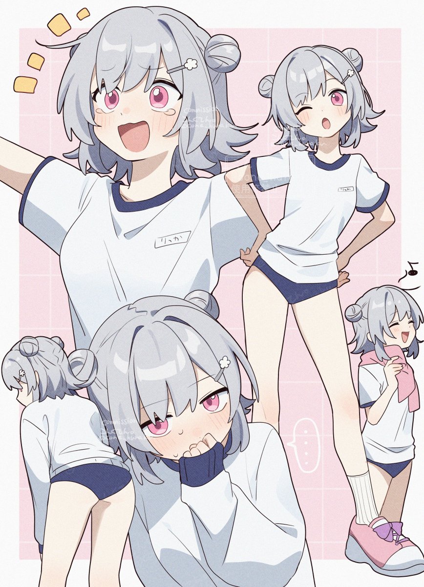 :d:o1boy1girlassblue burumablushborderburumaclosed eyesdouble bunfull bodygrey hairgrid backgroundgym shirtgym uniformhair bunhair ornamenthaircliplong sleevesmultiple viewsone eye closedopen mouthoutside borderpink backgroundpink eyespink shoesshirtshoesshort hairshort sleevessmilesocksspoken ellipsisstandingsweatwatermarkwhite borderwhite shirtwhite socks