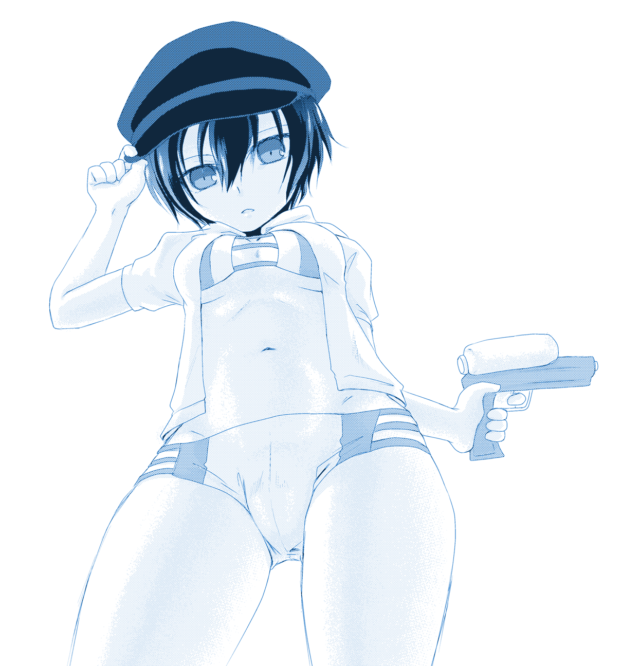 1girlbikiniblue themebreastsfemale focusgunhatmonochromenavelnewsboy capshort hairsmall breastssoloswimsuittankiniunderboobwater gunweapon